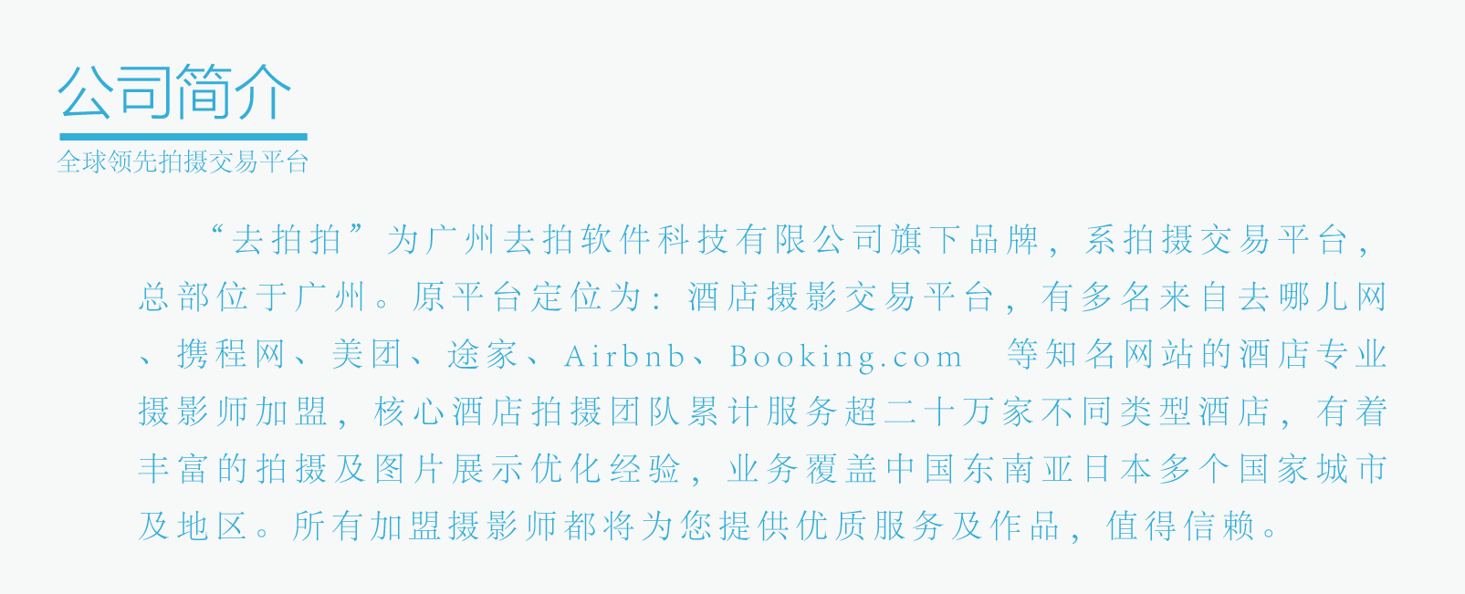 去拍拍自成立以来,始终坚定不移地将酒店摄影作为核心业务,精心耕耘,不断拓展,演进打造全球领先摄影平台。推动供给侧服务端,需求侧客户端的数字化升级,和来自全球各大OTA、酒店集团、知名摄影协会的专业摄影师一起努力为客户提供品质服务。
